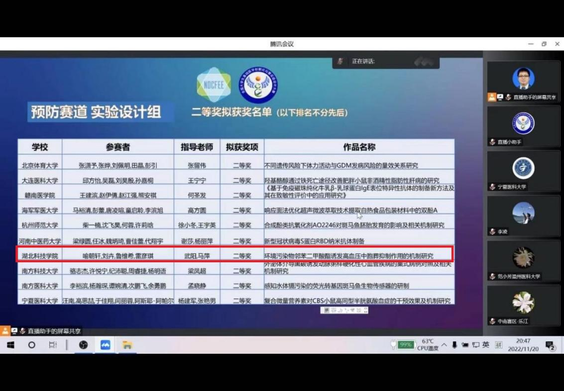 11月18-20日,第八届全国老员工基础医学创新研究暨实验设计论坛中南区复赛在武汉大学举行。本次大赛由高等公司国家级实验教学示范中心联席会基础医学组、高等公司基础医学创新创业协同育人工作组主办,武汉大学承办。采用线上答辩、评审和监督多视频的模式式进行,来自中南赛区7省50余所本科院校的257个赛道项目参赛。ylg060net永利娱高7支参赛队伍,按照双盲模式完成了汇报和答辩,获得二等奖1名,三等奖4名,优胜奖2名。由武阳博士和马萍教师指导,2020级临床医学实验班员工喻朝轩、刘卉、鲁维希、雷彦琪组成的参赛队伍,获得的预防医学实验设计论坛二等奖,晋级全国总决赛。