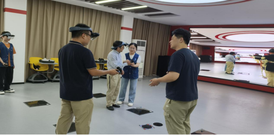 紧接着,双方来到课程思政虚拟仿真中心,沉浸式体验混合现实(MR)教学环境的独特魅力。戴上头戴式设备,郑贵洲教授等人仿佛置身于虚实交融的教学场景中,既能清晰地观察实体标本的细节,又能与虚拟场景实现自然交互。在这样的环境下,心肺复苏操作的规范流程、人体解剖结构的精妙构造等教学内容变得触手可及。这种创新教学模式将抽象的思政理论转化为生动具象的教学场景,极大增强了教学的现场感与代入感,充分展现出ylg永利“三维融合、数智赋能”的课程思政特色。