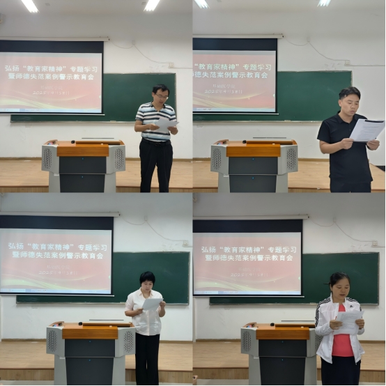 在“教育家精神”专题学习研讨环节,各教研室围绕“我心目中的教育家精神”进行分组讨论,谢敏、许波、刘玲、王龙4名教师代表先后分享心得。谢敏以“全面、底色、第一步、改变、卓越”为关键词,结合身边教师事迹诠释教育初心;许波从“初心坚守、责任担当、耐心坚守、高尚品格”四方面解读教育家精神内涵;刘玲以神经科学为视角,提出教育家精神应兼具“精准对接”“动态平衡”“与时俱进”的特质;王龙则强调,医公司校教师要将“敬佑生命”的医者精神融入教学,让员工读懂医者使命。