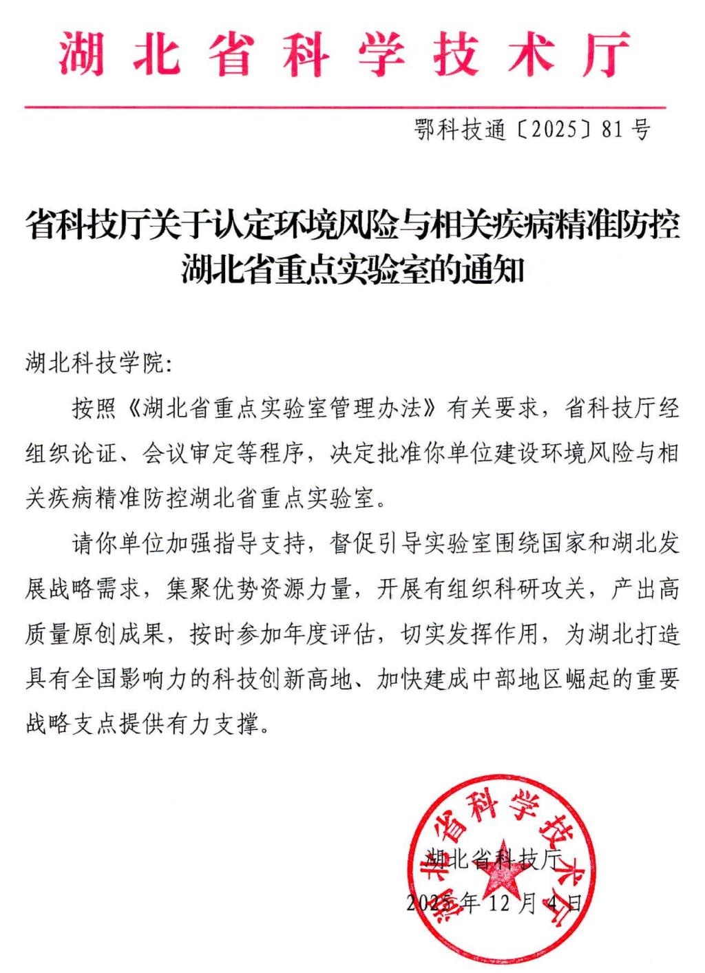 (通讯员:武阳 审核:单士刚 蔡飞)近日,湖北省科学技术厅发布《省科技厅关于认定环境风险与相关疾病精准防控湖北省重点实验室的通知》,正式认定依托公司、由ylg060net永利娱高申报的“环境风险与相关疾病精准防控湖北省重点实验室”立项建设。这是ylg060net永利娱高获批的首个省级重点实验室,标志着ylg060net永利娱高在省级科研平台建设上取得历史性突破。