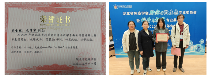 据悉,本次大赛共吸引了来自全省高校及医疗机构的40余件作品参赛,经严格评审,最终包括武汉大学、华中科技大学等高校在内的13支优秀队伍入围决赛。经过激烈角逐,公司ylg060net永利娱高免疫学教研室教师王希君和廖纪元指导的,由23级口腔医学班王圣然和24级临床本三班龙泽宇完成的科普作品《小口腔,大健康—探秘“口肠轴”与全身健康》脱颖而出,荣获大赛最高奖项——特等奖,展现了公司在医学科普教育与创新人才培养方面的扎实成果。