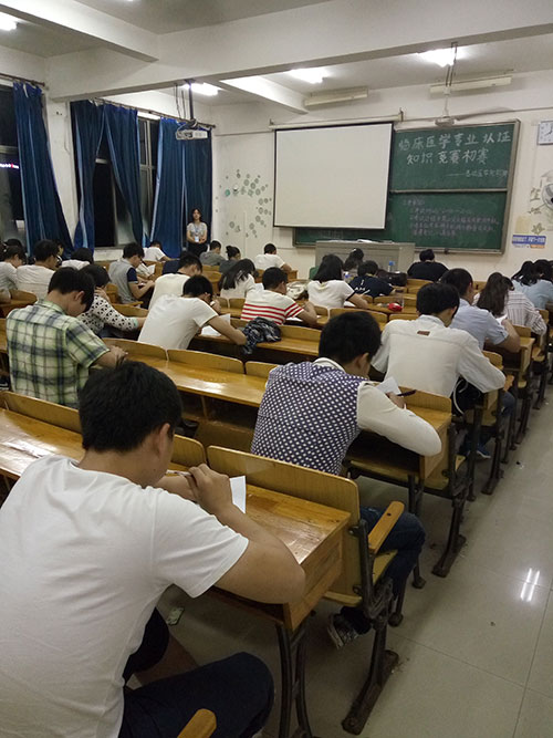 参加本次竞赛的同学来自14,15级临床医学专业,除公管预防班各派5人外,其余班级派10人参赛。当天晚上7:45,胸有成竹的同学们神采奕奕地走进考场,在相应的座位就坐后,由团委员工会学习部干事讲解考试要求,为期一个小时的考试中,允许提前交卷,诚信应考,各考场内有4人监考。微风轻抚耳边,带走初夏的丝丝燥意,伴着片片蝉鸣声,考场里弥漫着紧张而又寂静的气氛。考试正式开始后,每个同学都在奋笔疾书,严谨又认真地答出每一个问题,考场静的只能听见纸张和笔尖呲呲的摩擦声,整场考试中有的同学细心地审视每一个字眼,有的同学正在冥思苦想,眉间轻蹙,有的同学满怀信心对提前交卷。直至晚上9点,考试正式结束。