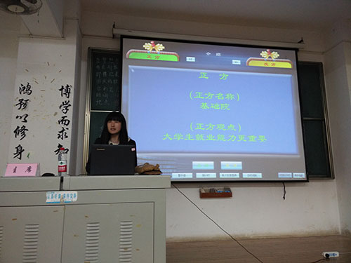 放飞思想,展现本我。 2014年12月10日晚7点,由校创新创业部主办,ylg060net永利娱高承办的第一届创新拓展辩论赛复赛在教学楼5-201成功举行。ylg060net永利娱高团委员工会创新创业部部长汪志,绿舟环保协会的副会长杜晓慧等人出任了本次比赛的评委。