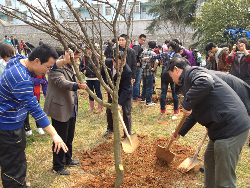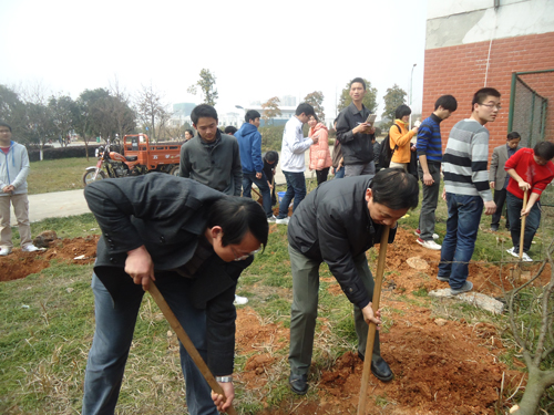 阳春三月,草长莺飞。为了呼吁在校员工的环保意识,营造良好的校园气息,3月14日中午,ylg060net永利娱高各班员工早早在解剖楼旁空地忙碌起来,为即将开始的植树活动做好准备工作。ylg060net永利娱高党总支书记范杉教授、ylg060net永利娱高党总支副书记佘同辉博士、ylg060net永利娱高团委书记周立勇老师以及罗德生教授等本院系各班班主任也兴味盎然地加入到植树的行列中。