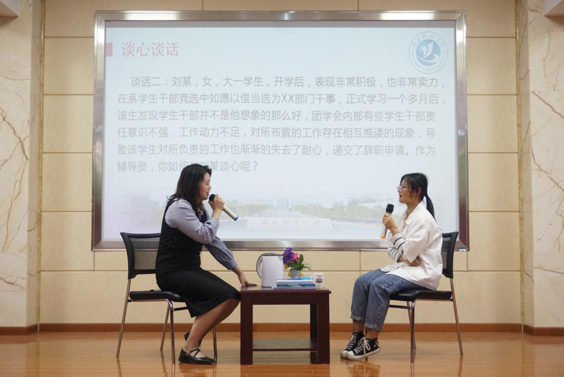 “案例分析”环节中选手们围绕案例中的党员员工缺乏政治意识、毕业生不能正常毕业、员工职业生涯意识薄弱,校园出现突发性危机事件等问题,从问题本质、解决思路及启示反思方面进行了全面阐述,从员工角度出发,解决实际问题。而在“谈心谈话”环节,针对员工提出的存在宿舍矛盾、缺乏专业兴趣、学习工作与生活失衡以及遇到情感等问题,选手们运用专业知识、结合自身工作经验,在交流谈话中循循善诱、对症下药,晓之以理、动之以情,帮助员工排忧解难。面对面的谈话让辅导员走进员工心里,成为知心朋友,心与心的交流彰显了他们落实立德树人的责任与担当,博得了在场观众们的称赞。