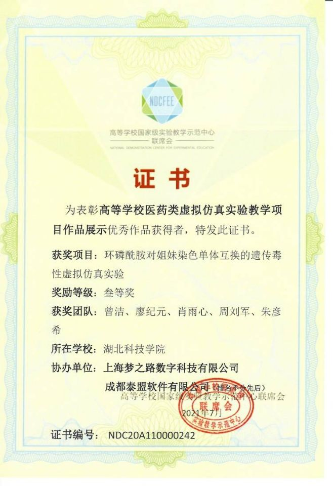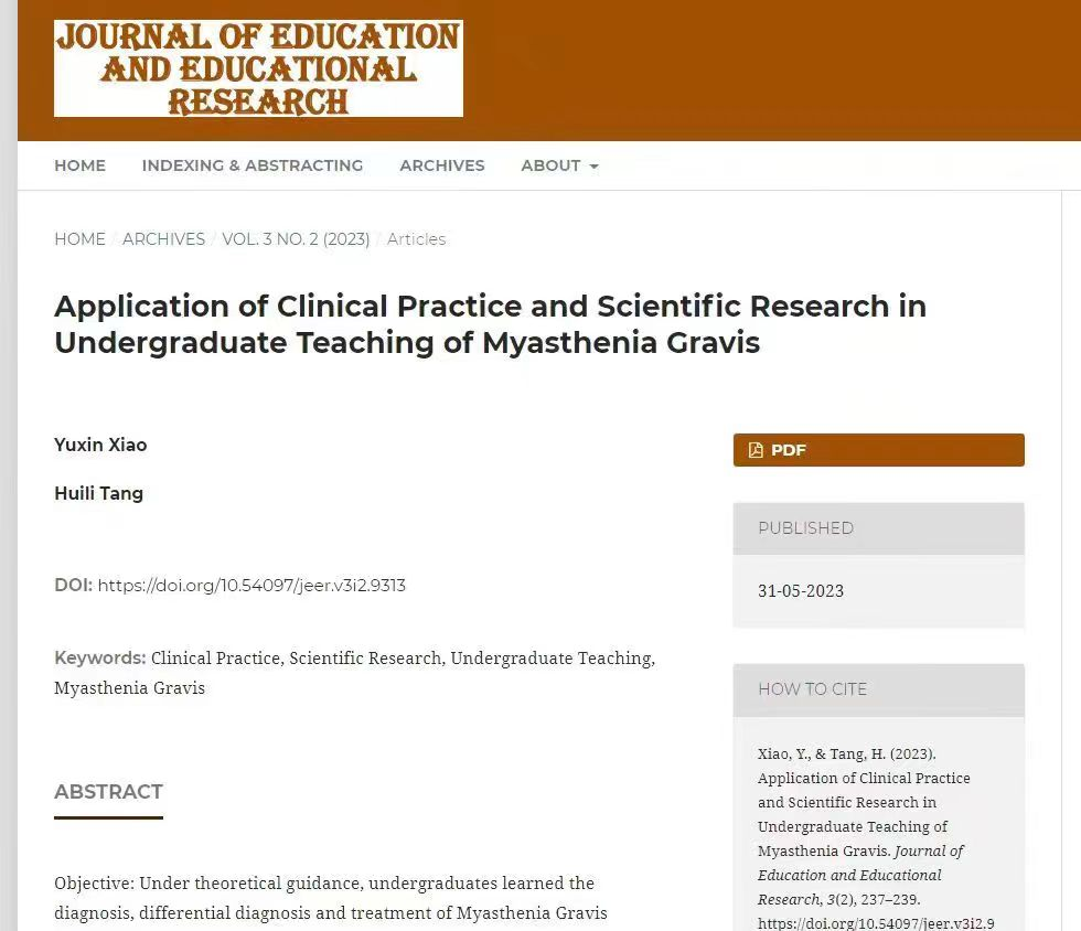 扎实的成绩是科研的基础。2021年3月,她加入医学虚拟仿真实验团队,同年6月作为代表进行汇报,相关项目斩获高等联席会颁布的国家级三等奖两项、计算机软著专利一项;2022年3月,加入校内青砖茶科研团队,参与动物实验、氟离子测定等相关工作,项目最终获得ylg永利互联网+校赛金奖,省赛铜奖;2023年1月,在跟随临床带教老师见习的同时,负责相关病案的收集整理和文章书写工作,在Journalofeducationandeducationalresearch上发表一篇神经内科方向论文。