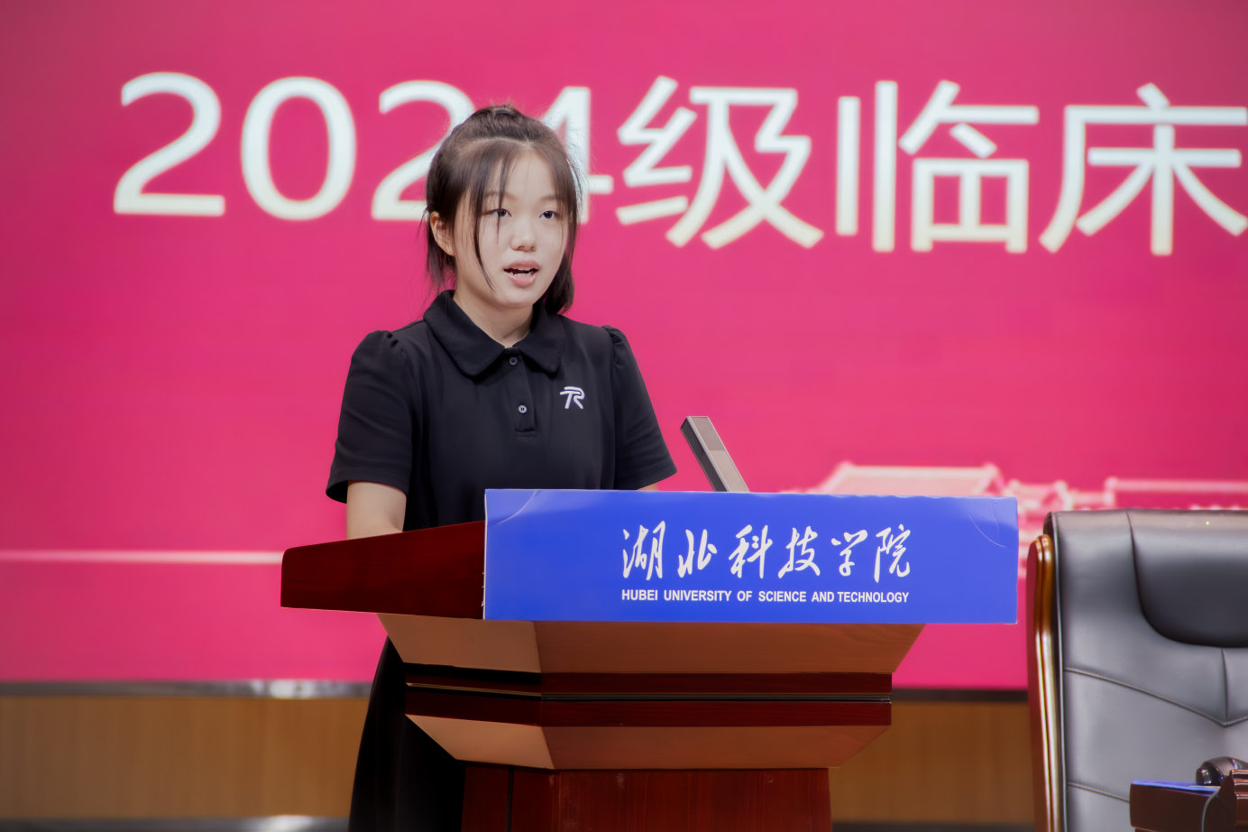 典礼在庄严的国歌声中缓缓拉开序幕,“健康所系,性命相托……”由2024年校“师德标兵”林丽老师领誓的医员工誓言响彻会场,誓词的内容不仅展现出临床医学专业的未来发展和追求目标,更是将医者的理想信念和使命担当显化。