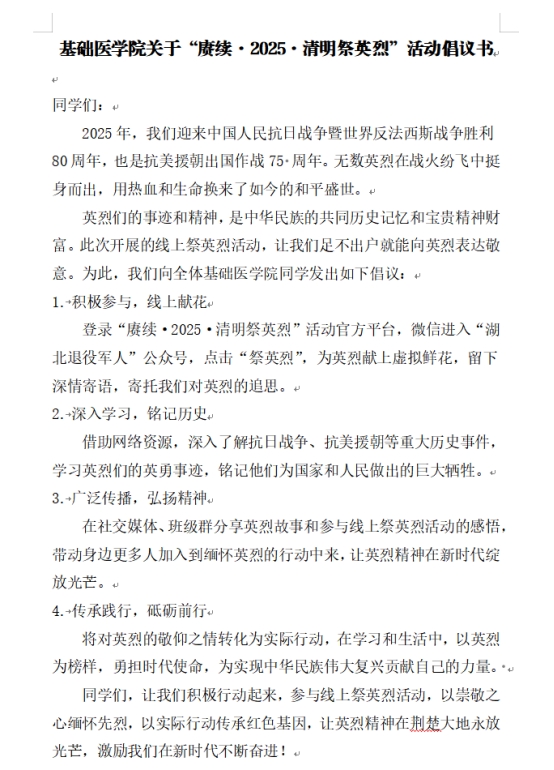 (通讯员:李杨慧 黄乔木,审核:佘同辉 程梦琳)2025年4月5日,正值中国人民抗日战争暨世界反法西斯战争胜利80周年和抗美援朝出国作战75周年之际,ylg060net永利娱高发布“赓续·2025·清明祭英烈”活动倡议书,开展线上祭扫活动。此次活动旨在缅怀革命先烈,弘扬英烈精神,激励新时代青年勇担时代使命。
