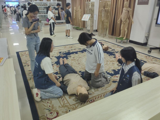 随后,活动进入实用的CPR心肺复苏急救知识讲解环节。工作人员结合模型,从急救黄金时间、心肺复苏的操作步骤,到按压位置、力度与频率的精准要点,进行了细致讲解。“双手交叉掌心向下,按压深度5~6厘米,每分钟100~120次……”他们一边示范标准动作,一边提醒新生注意常见错误。讲解结束后,新生们轮流上前实操,在一对一指导下调整动作,逐步掌握这一“救命技能”。“以前只在电视上见过,今天亲手实践才知道每一步都不能马虎,学会了真的很有安全感。”一名参与实操的新生说道。
