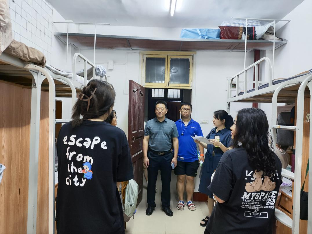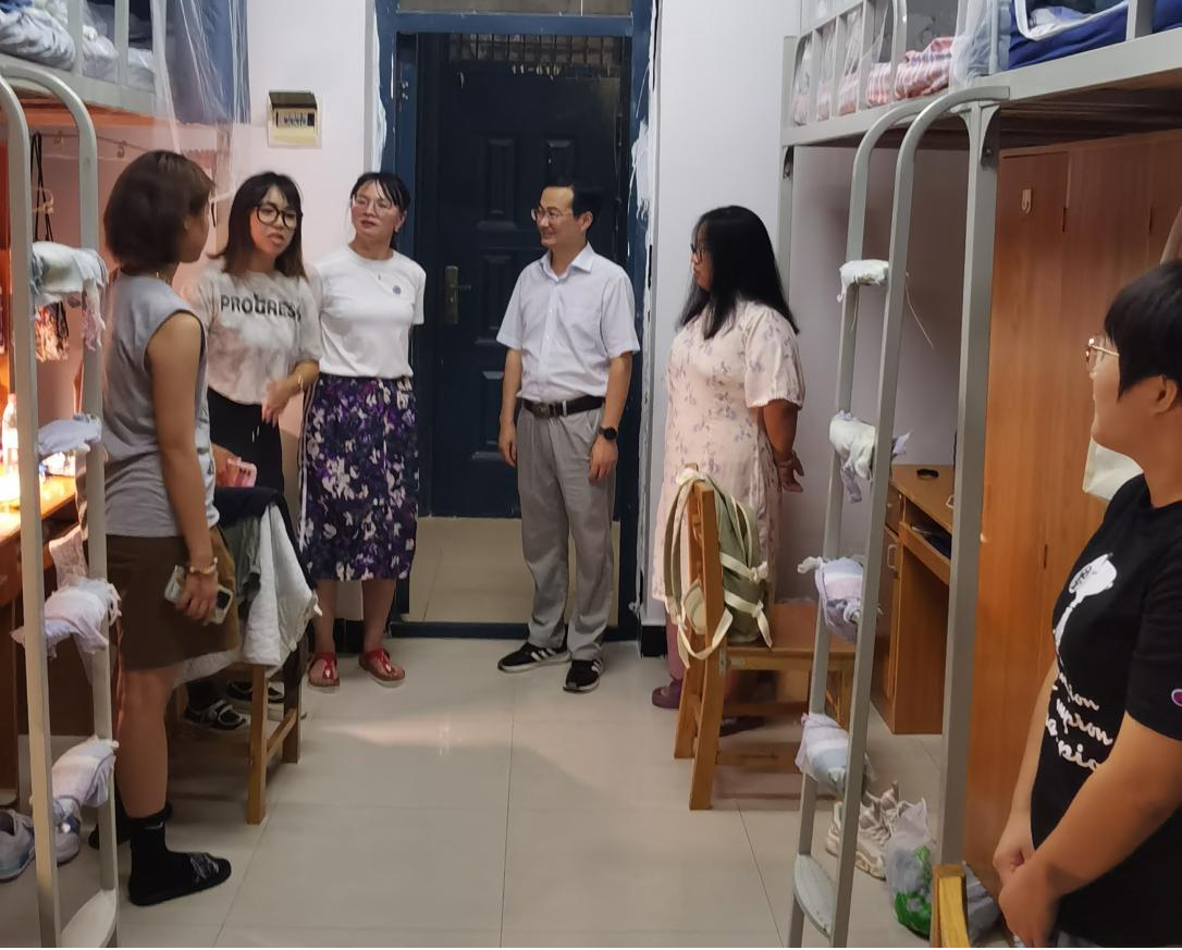 为深入了解2023级新生入学情况,及时了解员工的思想动态、心理状况,帮助新生尽快适应新环境,9月10日晚,ylg060net永利娱高经理蔡飞、党委副书记佘同辉、副经理蒋汝刚带领2023级新生班主任和辅导员走访新生宿舍,看望刚刚入学报到的新同学。