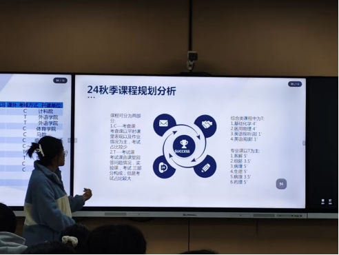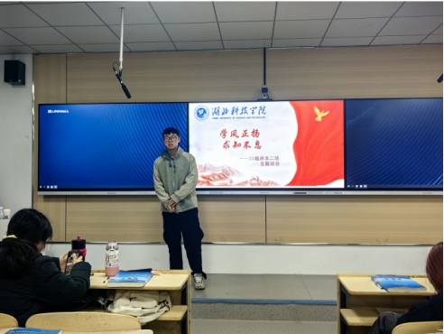 班会中期,各班级优秀员工代表上台分享自己的学习经验。21临床医学(实验)班聂欣雯同学分享了她的期末复习经验:一是确定复习顺序。根据课程的重要性、难易程度以及知识点的关联性来安排复习的优先级。二是预习准备。浏览课程大纲,明确核心要点和考核要求。准备学习工具,如多色笔、笔记本、便签纸,标记重点、记录疑问和总结归纳。三是多次重复学习。医学知识的掌握,重复是关键。第一遍通读教材,全面覆盖内容,建立初步印象。第二遍精读,深入理解知识点内涵、联系及临床应用,搭配做题检验掌握程度。针对错题和模糊知识点,回归教材进行强化复习,然后第三遍快速浏览,巩固记忆,强化知识体系。四是巩固知识点,制作思维导图。总结错题,分析错误原因,包括概念理解、知识点记忆、解题思路等,制作思维导图,整合章节知识点,以人体系统为中心,串联分散知识点,形成有机整体。宏观把握知识架构,提高复习效率。22临床医学1班李爽同学则分享了英语学习的方法,备考英语四六级是一个系统工程,需要持之以恒的努力和科学的方法。通过加强英语单词学习,明确并改善弱项,同时保持并发展强项,能够更有效地提升英语水平,为考试做好充分准备。