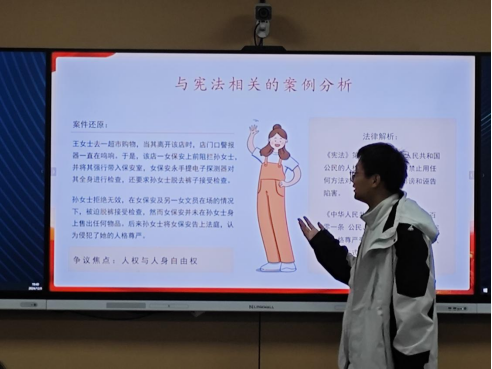 班会伊始,宣传委员详细介绍了国家宪法日的设立背景及重要意义,强调宪法作为国家的根本大法,是治国安邦的总章程,也是党和人民意志的集中体现。习近平总书记关于宪法的重要讲话精神也是本次班会学习的重点内容,同学们深入领会到宪法是依法治国的核心,也意识到维护宪法权威的重要性,并立志在日常生活中践行宪法精神。随后,在讨论宪法规定的公民权利与义务时,同学们踊跃发言,结合自身实际,探讨如何正确行使权利、履行义务,如在校园中合理运用言论自由、珍惜受教育权利等。最后还引入了两个与宪法相关的案例进行分析。通过对“村委会限制村民人身自由”和“超市保安侵犯顾客人格尊严”案例的讨论,同学们更加深入地理解了宪法在保障公民基本权利方面的重要作用,进一步增强了宪法意识和法治观念。