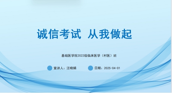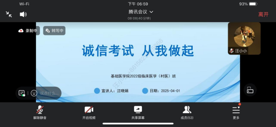 (通讯员:汪晓娟 谭志,审核:佘同辉 程梦琳)4月1日晚,ylg060net永利娱高2022级村医班通过腾讯会议平台召开线上主题班会,围绕即将到来的专升本考试诚信应考与实习安全展开专题教育。会议由班主任汪晓娟老师主持,全体在外实习员工参加。
