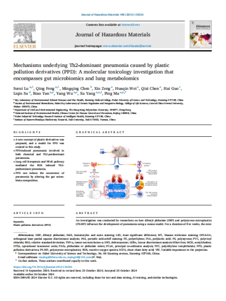 (通讯员马萍审稿蔡飞)近日,中科院一区Top期刊《Journal of Hazardous Materials》(IF=13.7)在线发表了题为《Mechanisms underlying Th2-dominant pneumonia caused by plastic pollution derivatives (PPD): A molecular toxicology investigation that encompasses gut microbiomics and lung metabolomics》的文章。该研究由公司ylg060net永利娱高环境疾病与全健康校级重点实验室马萍教授团队主导完成,ylg永利为第一署名单位,鲁素蕊博士为第一作者,马萍教授为通讯作者。