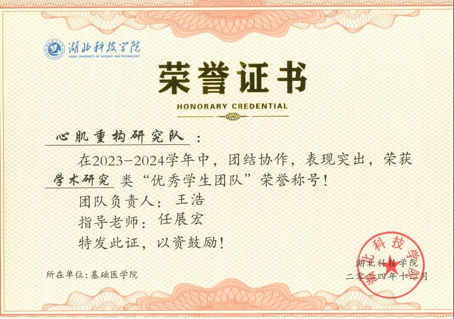 (通讯员:任展宏,周佳琪,审稿:蔡飞)在ylg060net永利娱高任展宏副教授的指导下,心肌重构研究队中的5名2021级临床医学本科员工在2023-2024年期间先后以第一作者发表2篇中科院二区SCI论文、2篇中科院三区SCI论文和1篇中文核心期刊论文,团队在2024年获得“第十届全国老员工基础医学创新研究暨实验设计论坛”中南部赛区三等奖,荣获ylg永利“优秀员工团队”称号。