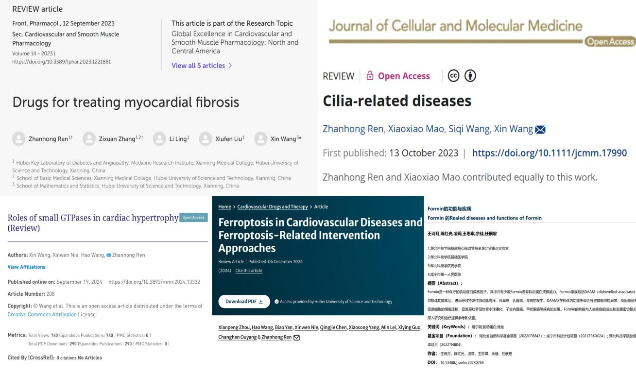围绕心肌重构研究方向,团队成员张紫轩同学在Frontiers in Pharmacology期刊(中科院二区,影响因子为5.6)上发表SCI论文《Drugs for treating myocardial fibrosis》,毛晓晓同学在Journal of Cellular and Molecular Medicine期刊(中科院二区,影响因子为5.3)上发表SCI论文《Cilia-related diseases》,聂欣雯同学的SCI论文《Roles of small GTPases in cardiac hypertrophy》发表在Molecular Medicine Reports期刊(中科院三区,影响因子为3.4),王浩同学的SCI论文《Ferroptosis in cardiovascular diseases and ferroptosis-related intervention approaches》发表在Cardiovascular Drugs and Therapy期刊(中科院三区,影响因子为3.1),王诗月同学在生命的化学杂志(中文核心期刊)上发表科研论文《Formin的功能与疾病》,周佳琪同学的第一作者SCI论文目前正在修改过程中。