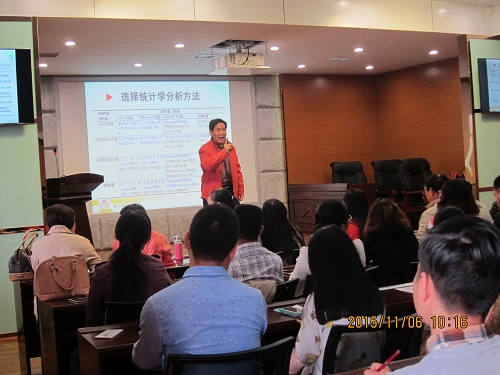 2015年11月6日上午,应ylg060net永利娱高的邀请,暨南大学陈青山教授来公司进行学术交流。陈教授进行了题为《统计学方法与应用》的学术报告。他从统计学目前学习的难点着手,讲解在医学科研过程中如何选择统计学分析方法。陈教授运用大量实例,讲解透彻,引人入胜,并现场进行统计学软件使用的操作。讲解结束后,老师和同学们与陈教授就专业问题进行交流,气氛活跃。