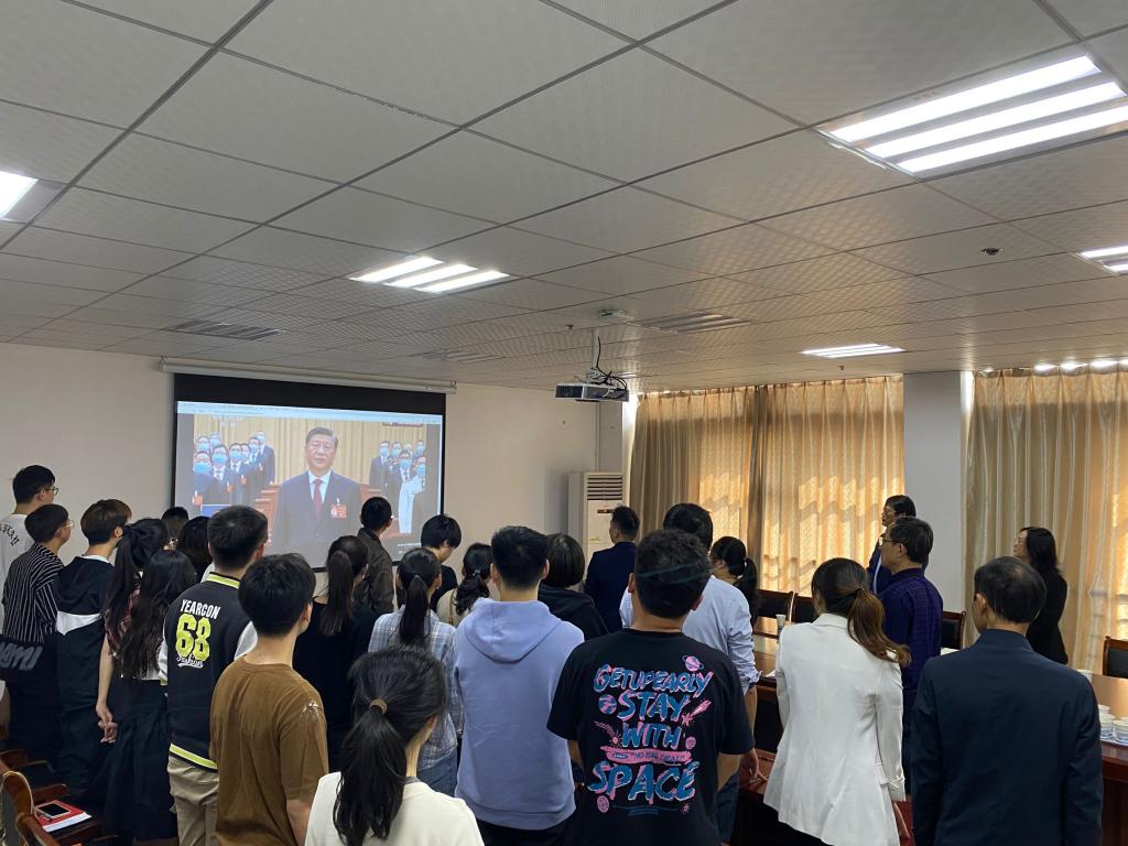 上午10时,会议开始。全场起立,高唱中华人民共和国国歌。随后,公司全体同志为毛泽东、周恩来、刘少奇、朱德、邓小平、陈云等已故老一辈无产阶级革命家和革命先烈默哀。师生们认真聆听习近平总书记的报告,会场上,气氛庄重热烈。会后,师生们纷纷表达自己的感受,情绪高昂。
